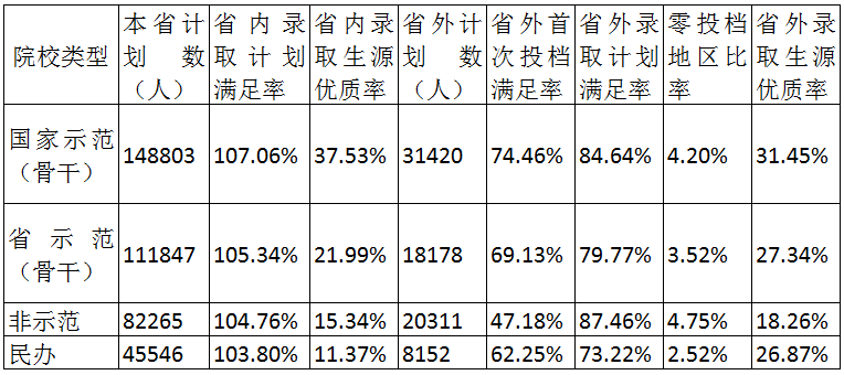 为较为全面地反映高职院校招生录取情况,本报告设定了“省内录取计划满足率”、“省内录取生源优质率”、“省外首次投档满足率”、“省外录取计划满足率”、“零投档地区比率”和“省外录取生源优质率”等指标,其中“录取生源优质率”用院校录取线高于省控线的幅度与省控线的百分比进行表征。抽样调查结果如表所示。