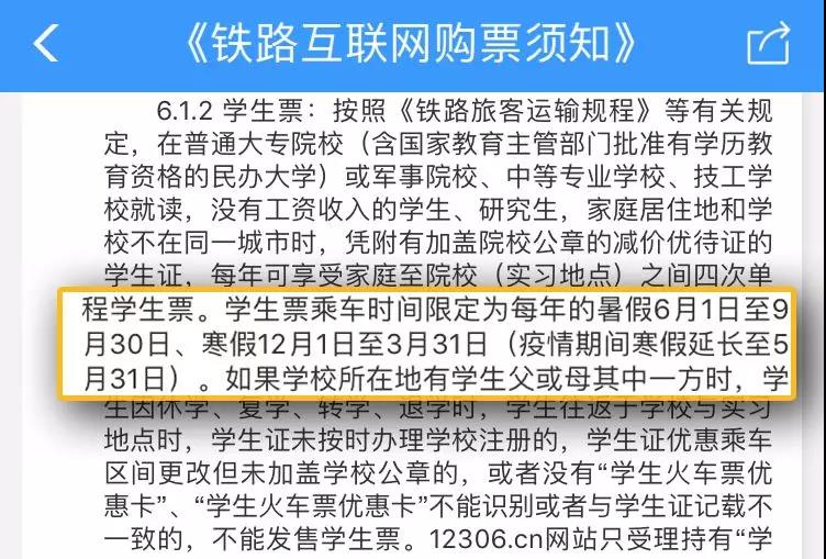 《铁路互联网购票须知》:寒假学生票乘车时间为12月1日至3月31日(疫情期间延长至5月31日)。