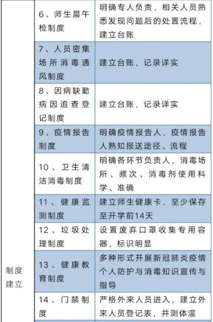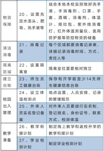 《达标细则》在组织领导、方案制定、制度建立、全员培训、物资保障、清洁消毒、隔离区域、建立台账、校园管理、教学准备等10个方面,细化分解为27项具体核验条件,每一项条件核验为“否”的,即视为“不合格”,经整改仍不到位的,不得安排开学。