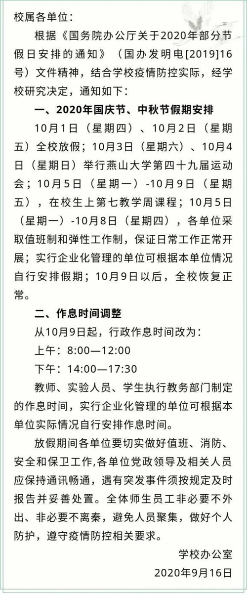 燕山大学官方微博发布关于国庆节、中秋节放假及变更作息时间的通知↓↓↓