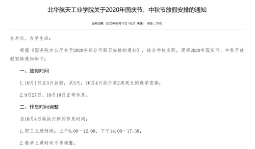 北华航天工业学院发布关于2020年国庆节、中秋节放假安排的通知↓↓↓
