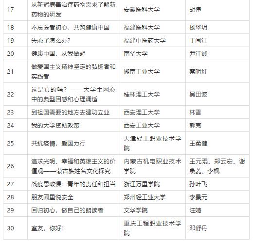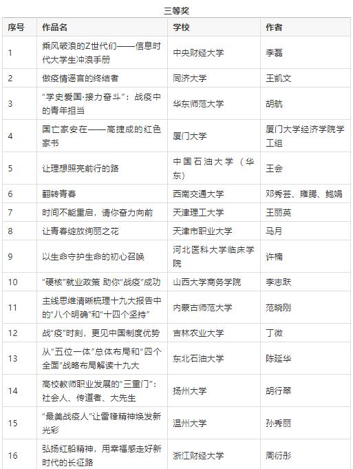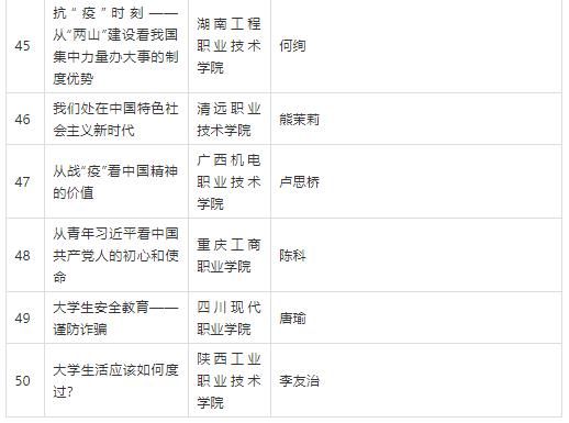在教育部思政司精心指导和全国高校积极参与下,由高校思想政治工作队伍培训研修中心(高等教育出版社)、全国高校思想政治工作网、高校辅导员网络培训中心联合举办的2020年度全国高校思想政治工作“金微课”征集活动现已完成作品征集与专家评审,共遴选出一等奖10件、二等奖20件、三等奖30件、优秀奖50件,以及热点聚焦奖、教学设计奖、教学风采奖、最佳制作奖等单项奖各1件,现将获奖名单予以公示。