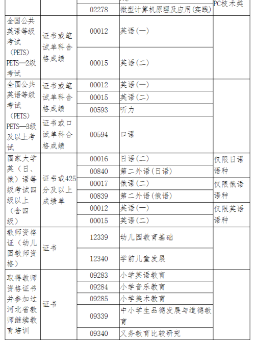(一)“前置学历”为专科的毕业生,报考河北省高等教育自学考试本科专业,使用《学籍表》中已取得合格成绩的课程,可免考除英语(二)(00015)、日语(二)(00016)、俄语(二)(00017)、概率论数理统计(经管类)(04183)、线性代数(经管类)(04184)以外的课程名称、内容相同或相近的公共课及计算机基础课。