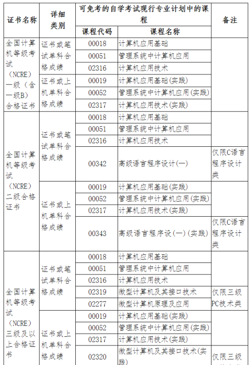 注:表格中“可免考的自学考试现行专业计划中的课程”如有新调整或变化时,按最新的专业计划执行。