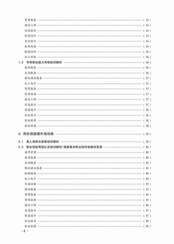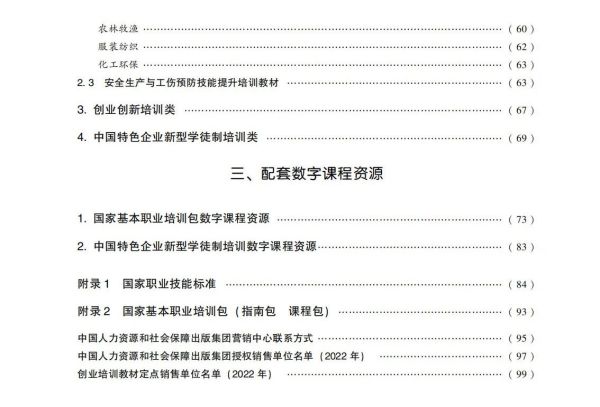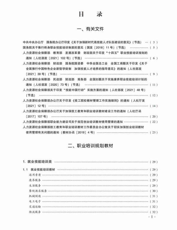 《目录》中就业技能培训类、岗位技能提升培训类教材按通用素质、康养服务、生活服务、机械制造、电工电子、交通运输、商贸服务等职业类别分别排序, 每一职业类别中按汉语拼音顺序排序。已正式出版的《国家职业技能标准》和《国家基本职业培训包(指南包 课程包) 》作为附录供查阅。