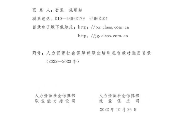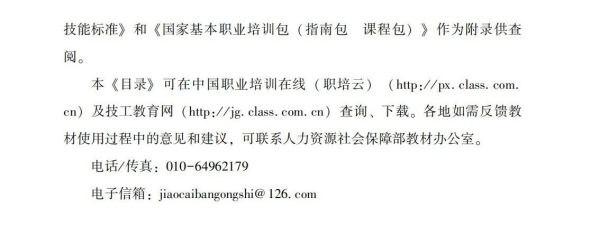 本《目录》可在中国职业培训在线(职培云) (http:/ / px. class. com.cn) 及技工教育网(http:/ / jg. class. com. cn) 查询、下载。各地如需反馈教材使用过程中的意见和建议, 可联系人力资源社会保障部教材办公室。