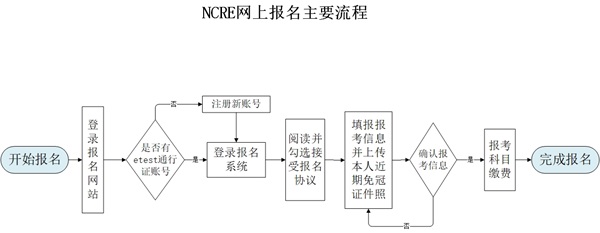 考生登录中国教育考试网(http://www.neea.edu.cn)点击进入“全国计算机等级考试”项目,按照相关提示完成信息填写、照片上传、缴费等步骤。