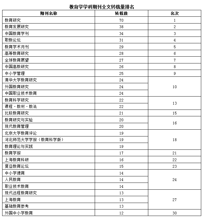 书报资料中心的各学科高水平编辑和专家顾问评估团队,对几千种人文社科报刊上的学术论文进行同行评议并挑选出其中约13000余篇的优秀论文由“复印报刊资料”二次转载。评价研究中心从论文转载量、转载率和综合指数三个量度,形成高等院校、社科院(联)、党政干部院校三大系统和21个人文社科学科的学术期刊和教学科研机构共计160余张排名表。其中包括了教育学学科学术期刊排名。